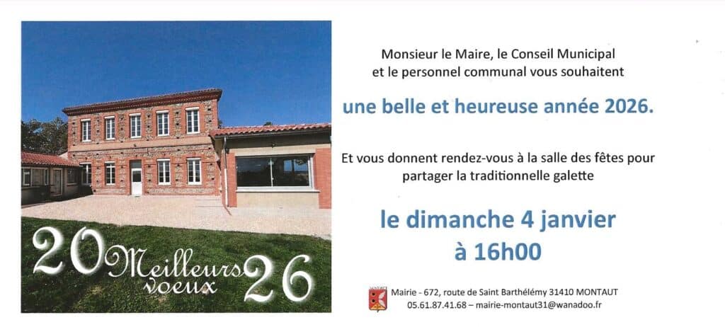 BONNE ANNÉE 2026 !Monsieur le Maire, l’ensemble du Conseil Municipal et le personnel communal vous souhaitent une bonne et heureuse année 2026.Rendez vous dimanche 4 janvier à 16h pour partager la traditionnelle galette à la salle des fêtes